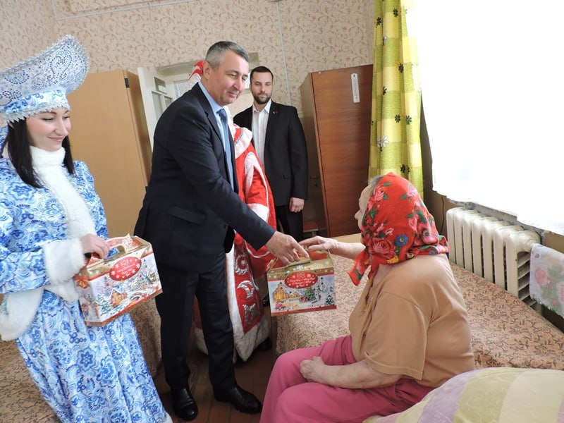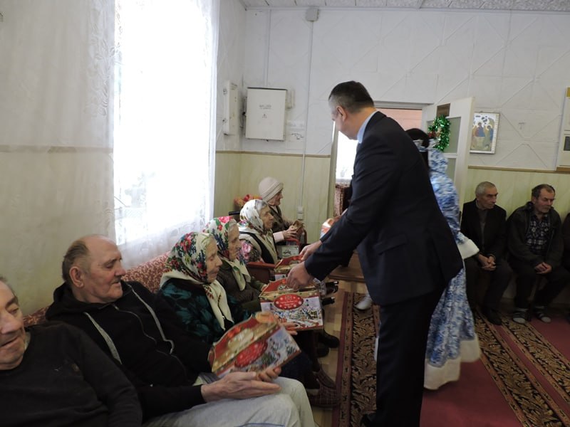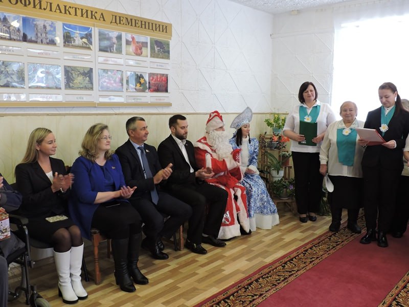 Высокие гости тепло поздравили с Новым годом и Рождеством проживающих в отделении, а это на сегодняшний день 25 человек, вручили им подарки. Создать праздник для пожилых людей помогла вокальная группа «Пой, душа!» отделения дневного пребывания для граждан пожилого возраста Территориального центра социального обслуживания населения Докшицкого района.