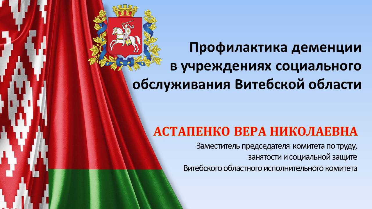 Намеснік старшыні камітэта па працы, занятасці і сацыяльнай абароне Віцебскага абласнога выканаўчага камітэта Вера Мікалаеўна Астапенка прыняла ўдзел у 1-ай Міжнароднай канферэнцыі па хваробе Альцгеймера і дэменцыі "Альцрус", у рамках якой ёю асветлена работа па прафілактыцы дэменцыі ва ўстановах сацыяльнага абслугоўвання Віцебскай вобласці, а таксама асноўных аспектах навукова-метадычнага супрацоўніцтва ў гэтай сферы і інавацыях у сістэме сацыяльнага абслугоўвання вобласці, перспектывах развіцця.