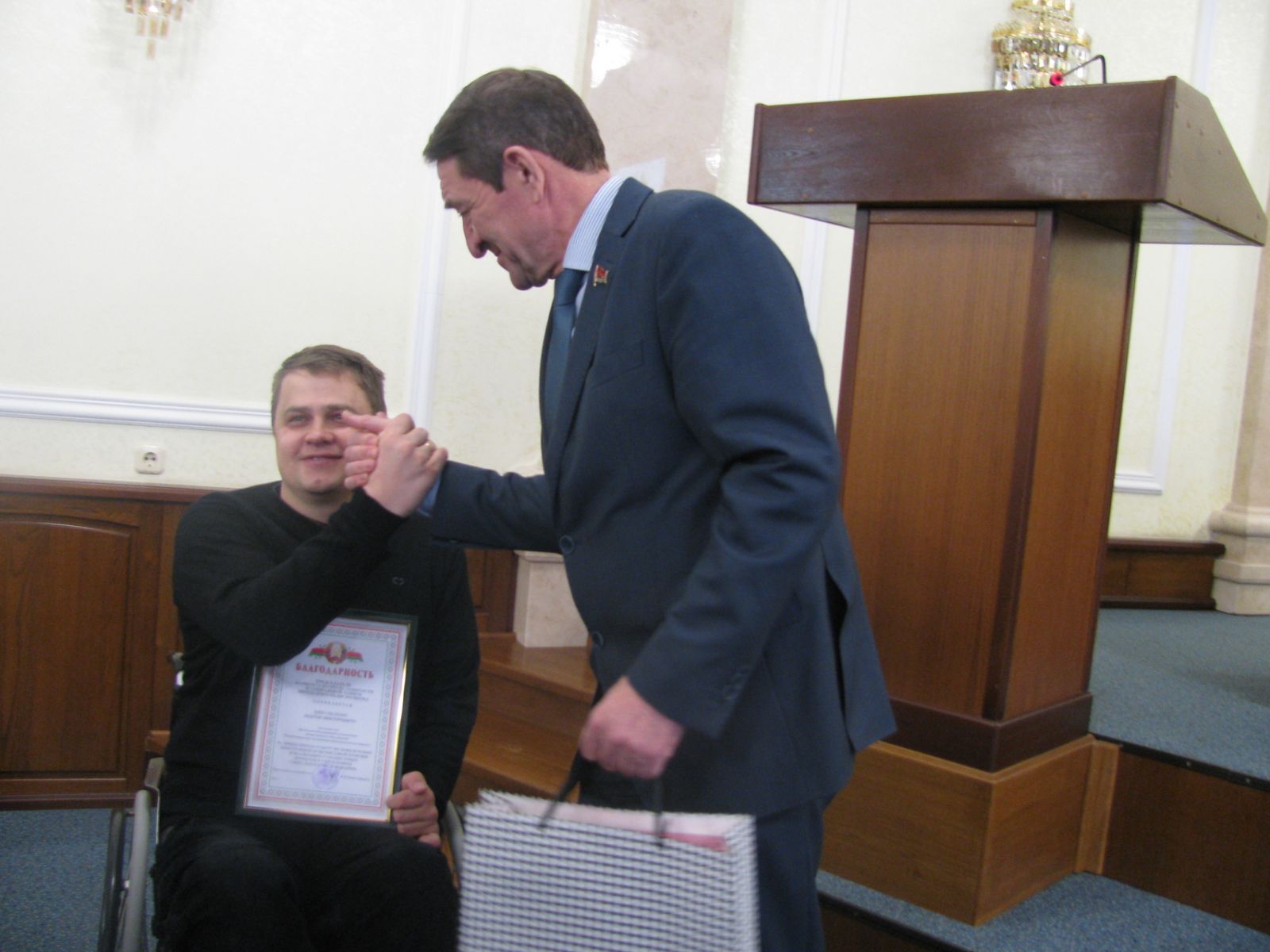 Председателем комитета по труду, занятости и социальной защите Витебского облисполкома А.Н.Христофоровым были вручены благодарности председателям общественных объединений инвалидов Витебской области за эффективную работу по реализации положений Конвенции о правах инвалидов и решение проблемных вопросов людей с инвалидностью.