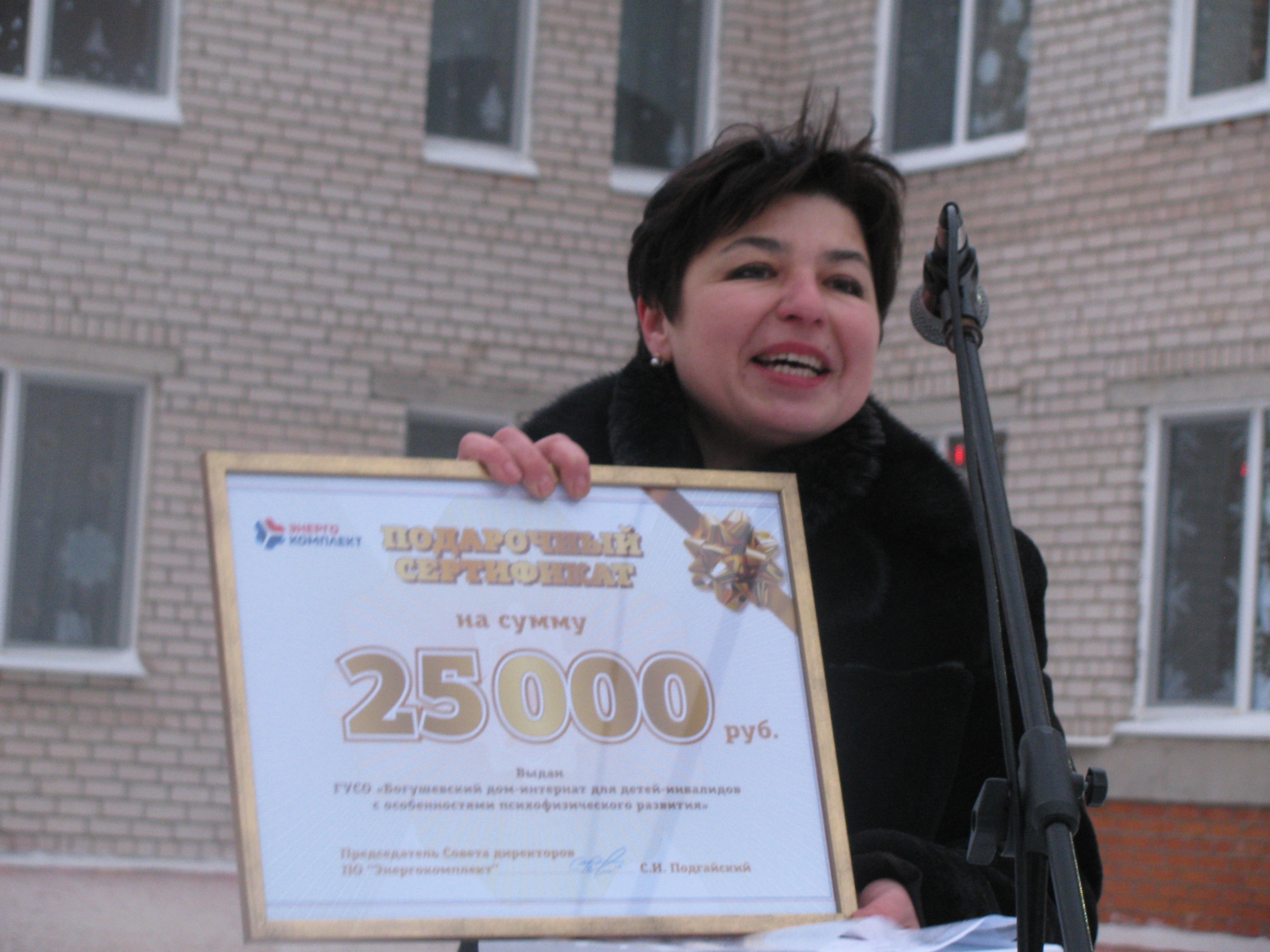 Производственное объединение «Энергокомплект» оказывает помощь дому-интернату уже много лет. Председатель Совета директоров производственного объединения «Энергокомплект» Сергей Иванович Подгайский, заместитель генерального директора Надежда Сергеевна Подгайская и член Совета директоров Елена Валерьевна Подгайская приняли самое активное участие в акции. Предприятием "Энергокомплект и семьей Подгайских был вручен сертификат на сумму 25 тысяч рублей, для приобретения технологического оборудования на пищеблок учреждения, а также каждый воспитанник в доме интернате получил от данного предприятия новогодний подарок и сказку с Дедом Морозом и Снегурочкой.