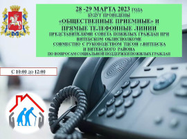 28-29 марта 2023 года с 10.00 до 12.00 представителями Совета пожилых граждан при Витебском облисполкомесовместно с руководством ТЦСОН г.Витебска и Витебского района будут проведены «Общественные приемные» и прямые телефонные линииПО ВОПРОСАМ СОЦИАЛЬНОЙ ПОДДЕРЖКИ ПОЖИЛЫХ ГРАЖДАН:28.03.2023: -ТЦСОН Витебского района, тел. 673028, адрес: г.Витебск, ул.Комсомольская,16;- ТЦСОН Октябрьского района г.В...