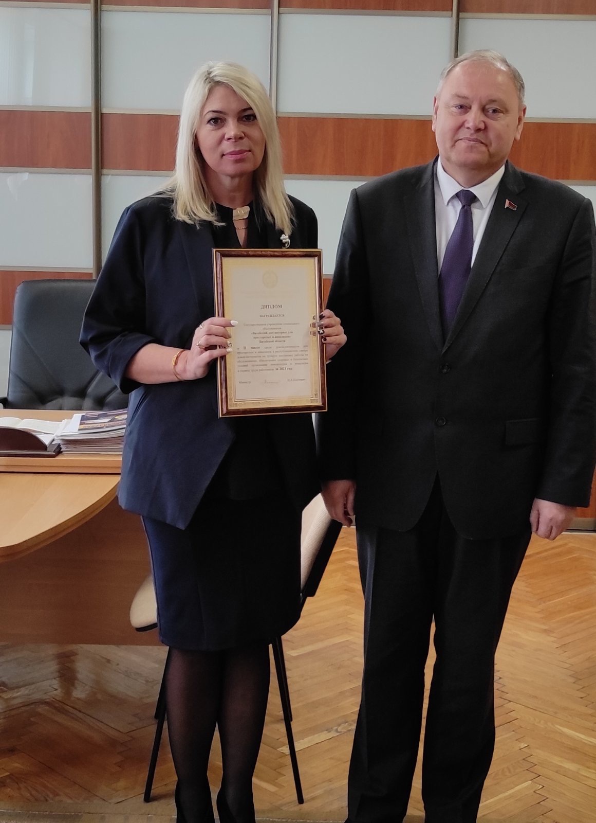 Кроме этого, за лучшую постановку работы по обслуживанию, обеспечению здоровых и безопасных условий проживания пожилых граждан и инвалидов и охраны труда работников Владимир Петрович поблагодарил за работу Витебский дом- интернат для престарелых и инвалидов, занявший 2 место в республиканском смотре домов- интернатов.