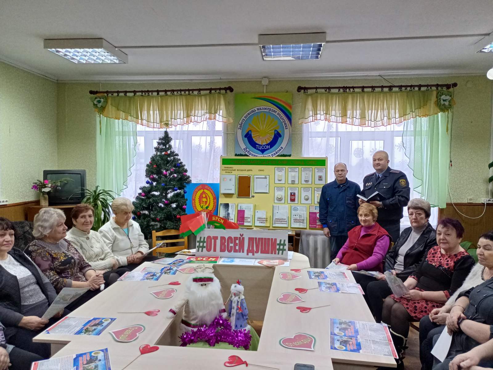 В мероприятии принял участие Карманов Г.А., старший инспектор отделения по охране объектов в г.Дубровно Департамента охраны МВД Республики Беларусь, который рассказал о профилактических мерах безопасности пожилых граждан, поздравил с Новогодними праздниками, пожелал мира и активного долголетия.