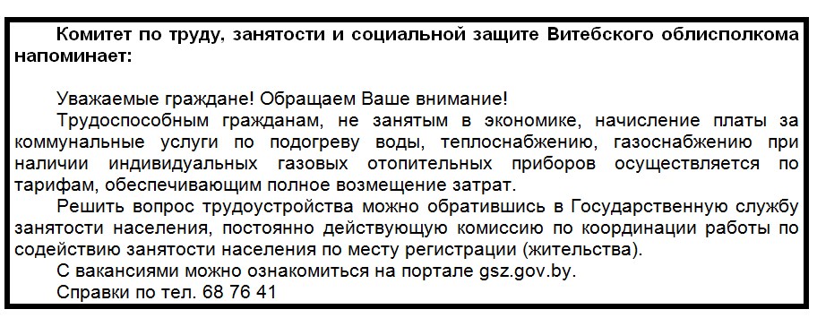Комитет по труду, занятости и социальной защите Витебского облисполкома напоминает: