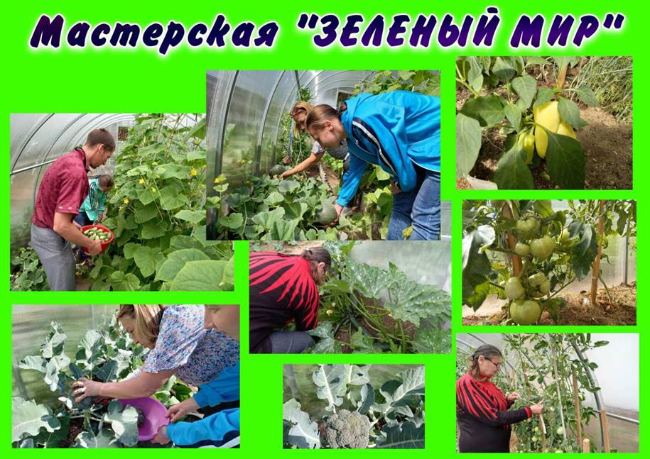 Посещающие отделение дневного пребывания для инвалидов Территориального центра социального обслуживания населения Городокского района с удовольствием занимаются трудотерапией в реабилитационно- трудовой мастерской «Зеленый мир» под руководством руководителя кружка Смирновой Т.Н. Под надежным теплым куполом теплиц растут томаты, огурцы, перец, редис, арбузы, дыни. В открытом грунте выращивается капуста, картофель, морковь, петрушка, кабачки, лук, укроп, шпинат, салат. Уход за огородом и цветниками - это настоящий труд. Ребята занимаются прополкой, поливом, рыхлением, пасынкованием, подвязкой. Но самое главное, они видят результат своего труда, чувствуют, что им по силам такая работа. С грядок урожай попадает на кухню. Ребята консервируют овощи, осваивают новые рецепты салатов, горячих блюд. Но и те, кому огородные работы не по силам, все лето получают полезную экологически чистую продукцию к обеду .