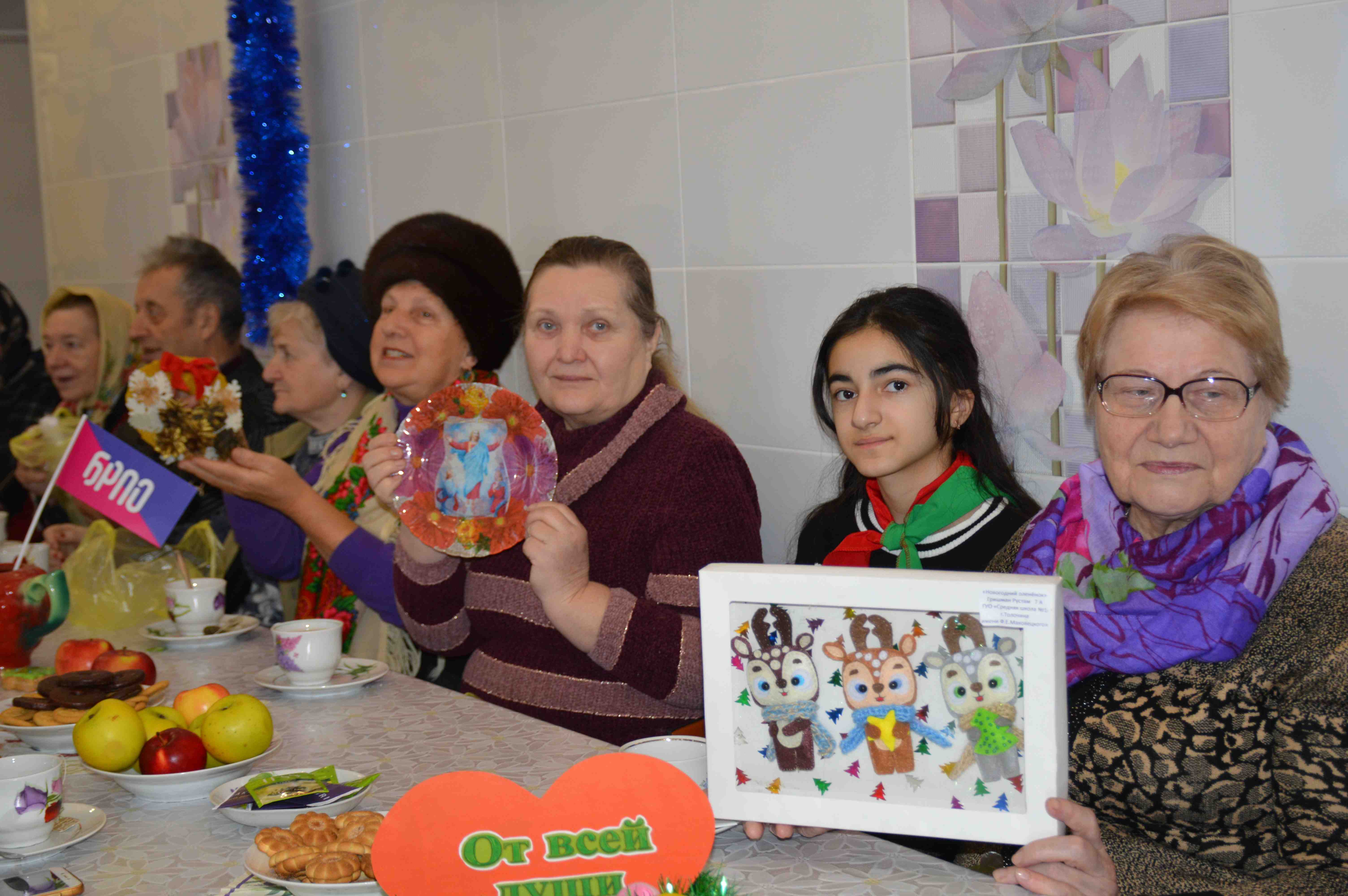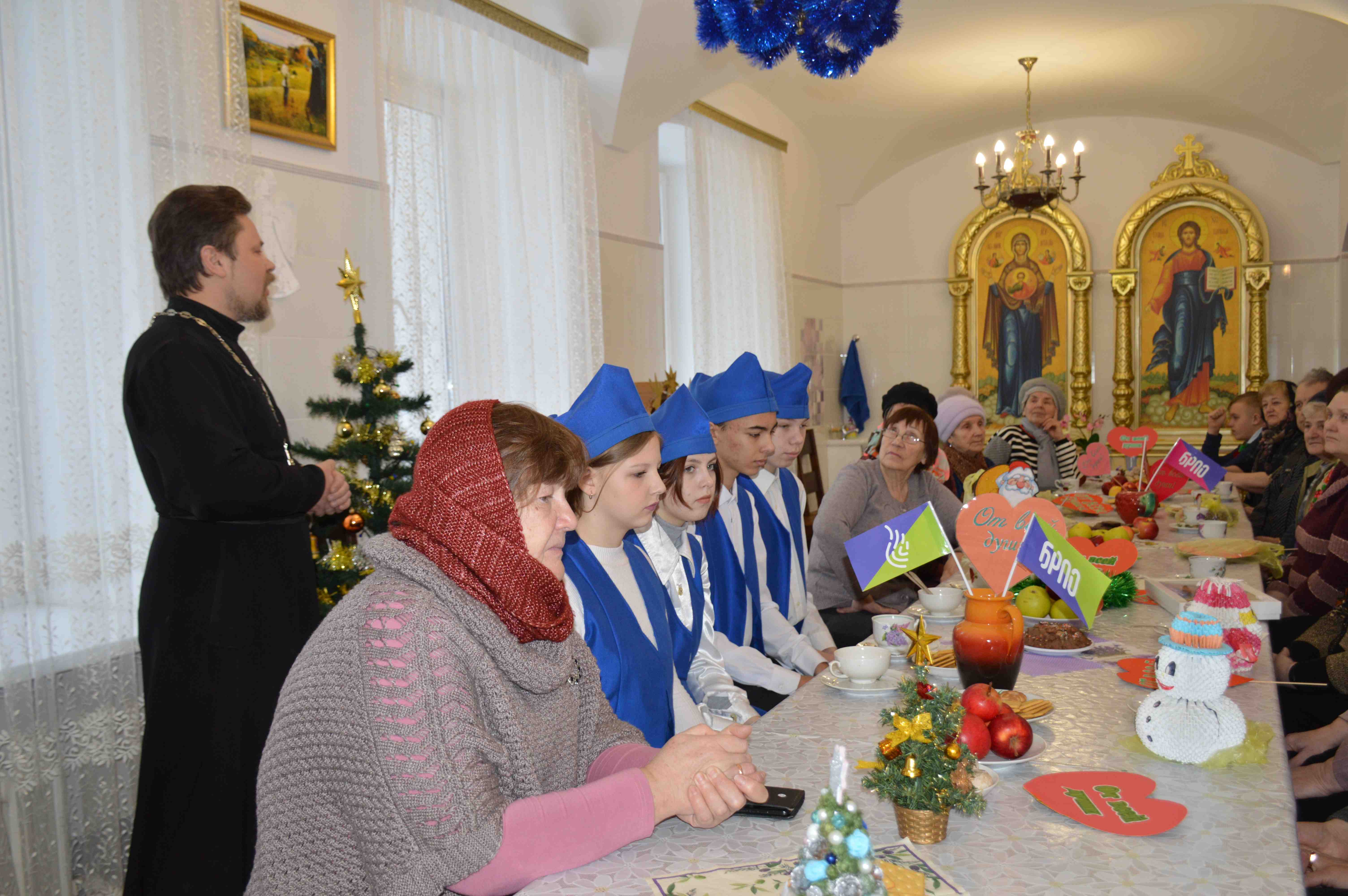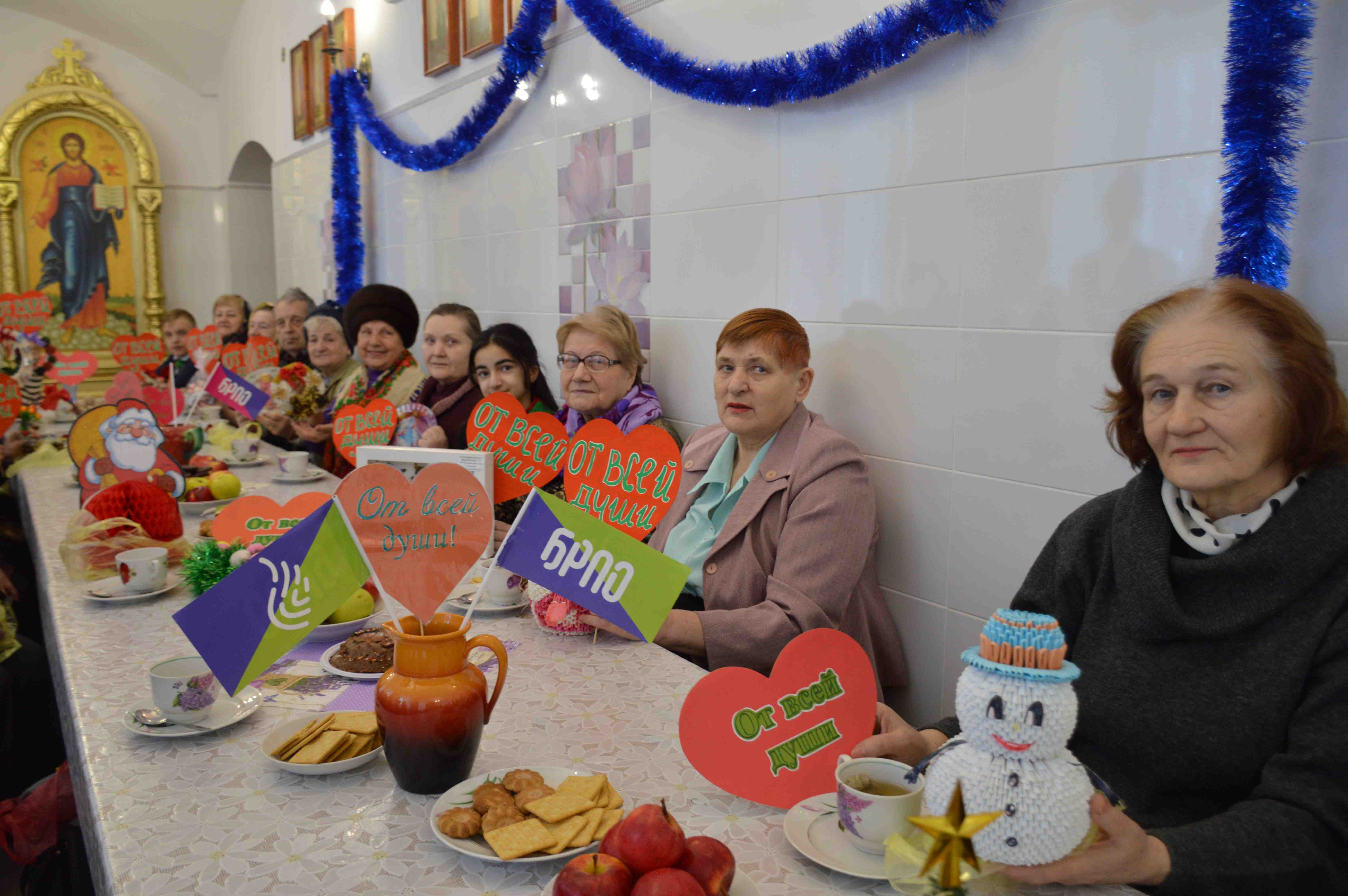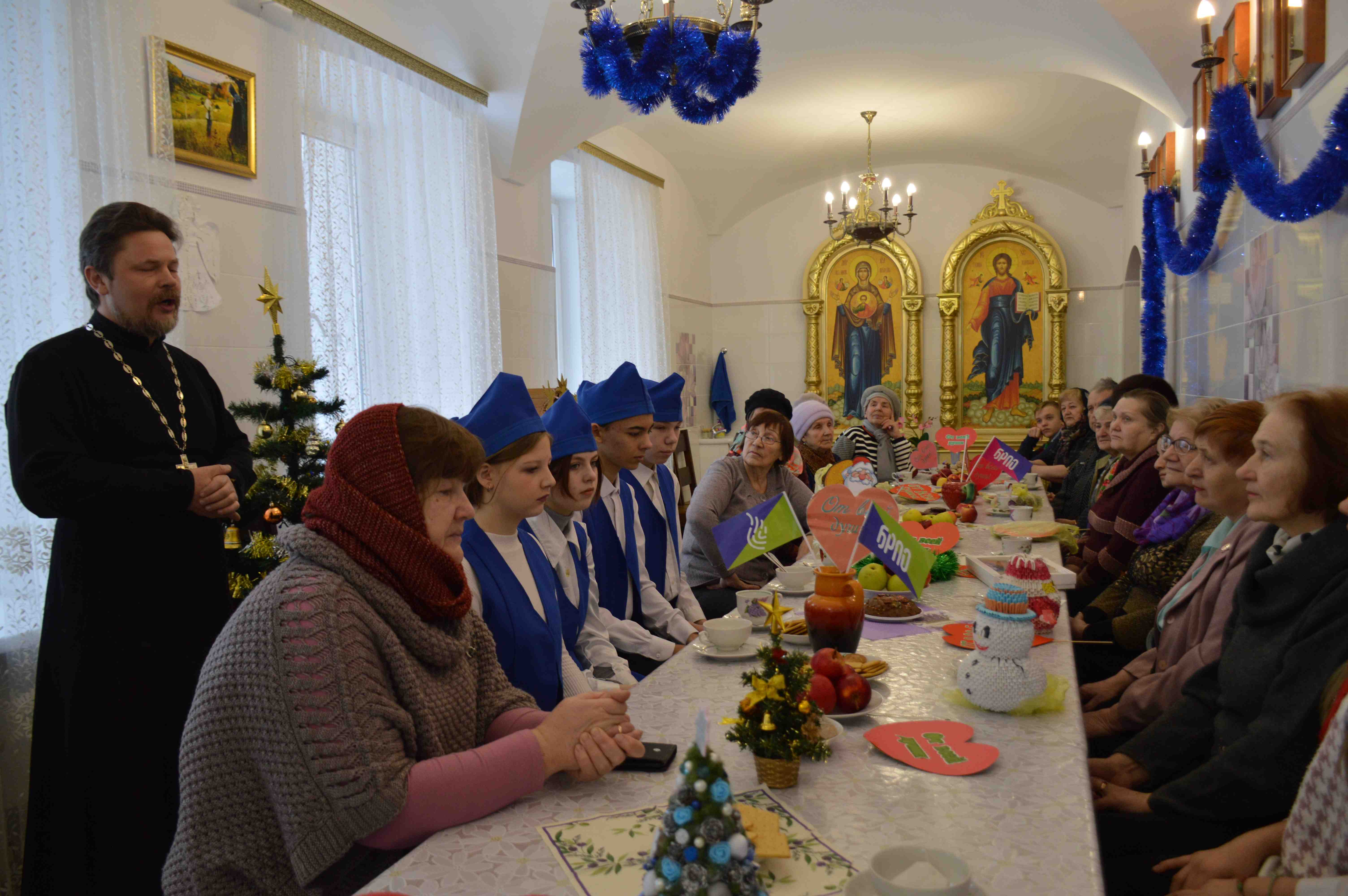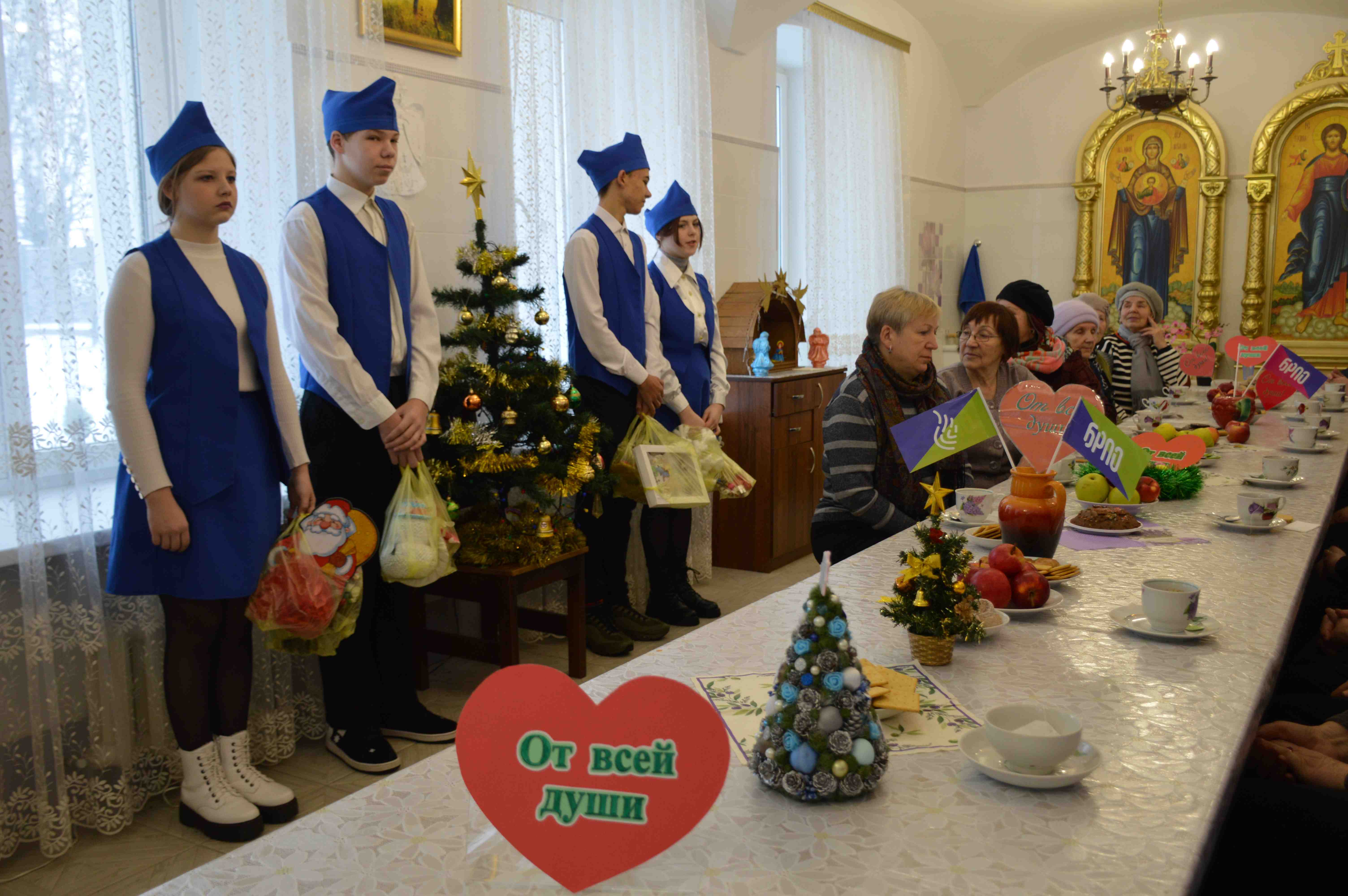 Юные волонтеры помогли в уборке снега на территории монастыря, после чего подготовили музыкальное поздравление, подарки для присутствующих коллег «серебряного возраста».