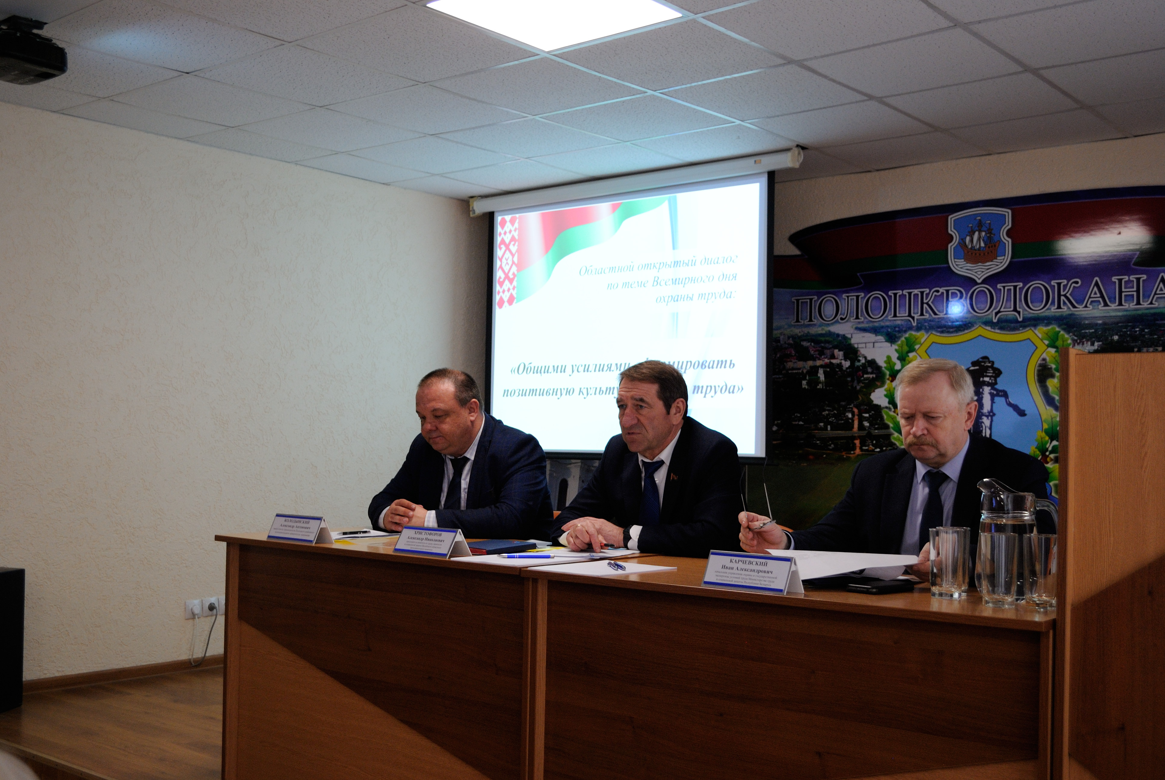 В преддверии Всемирного дня охраны труда на базе филиала "Полоцкводоканал" УП "Витебскоблводоканал" при участии начальника управления охраны труда и государственной экспертизы условий труда Министерства труда и социальной защиты Республики Беларусь Ивана Александровича Карчевского, председателя комитета по труду, занятости и социальной защите Витебского областного исполнительного комитета Александра Николаевича Христофорова, заместителя председателя Полоцкого райисполкома Александра Антоновича Колодынского состоялся областной открытый диалог "Общими усилиями сформировать позитивную культуру охраны труда".
