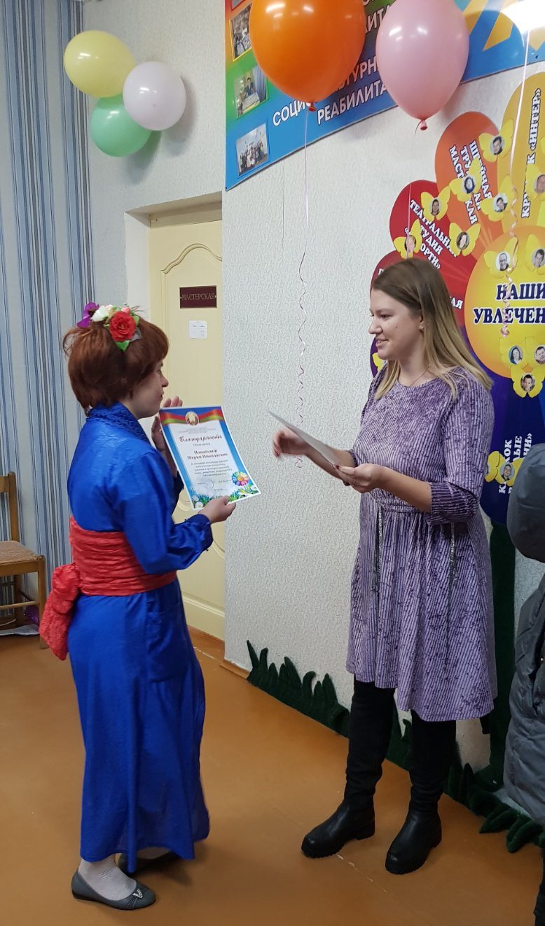 Радостное настроение подарили посещающим отделения не только весёлые конкурсы, но и приятные сюрпризы: были подарки от Поставской районной организации ОО "Белорусский союз женщин" и волонтёра, организатора социального проекта "Особенные, как все" Риты Шилей. Тёплые слова поддержки адресовала присутствующим Раковская Мария Юрьевна, директор ТЦСОН. Самым активным, целеустремленным были вручены дипломы за активное участие в культурно-массовых мероприятиях.