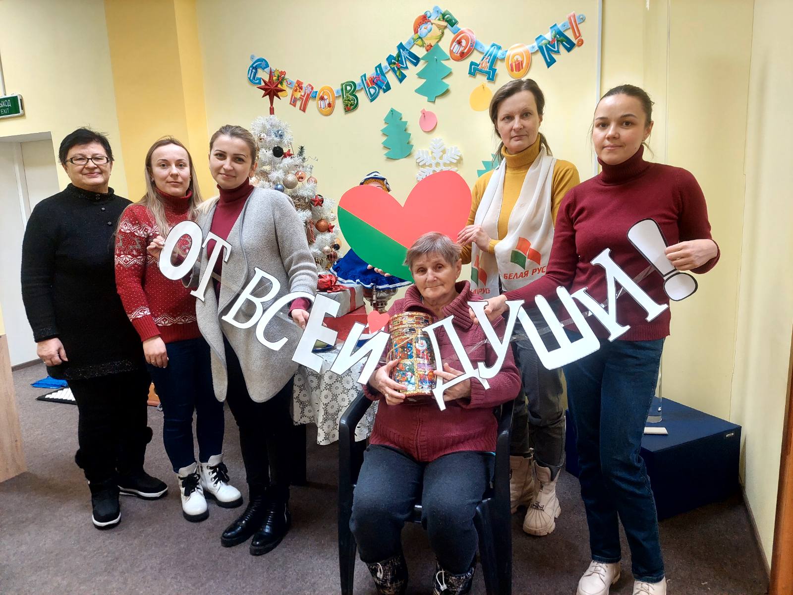 "ОТ ВСЕЙ ДУШИ" и от всего сердца, в рамках Республиканской акции, специалисты ТЦСОН Витебского района отделения социальной реабилитации для граждан пожилого возраста и инвалидов аг.Кировская, представители агрокомплекса "Возрождение" ОАО "Витебская бройлерная птицефабрика" , Кировской сельской библиотеки, Старосельской ДШИ, общественного объединения "Белая Русь" поздравили с Новогодними праздниками и Колядами одного из самых старейших посетителей отделения Евдокимову Тамару Францевну.