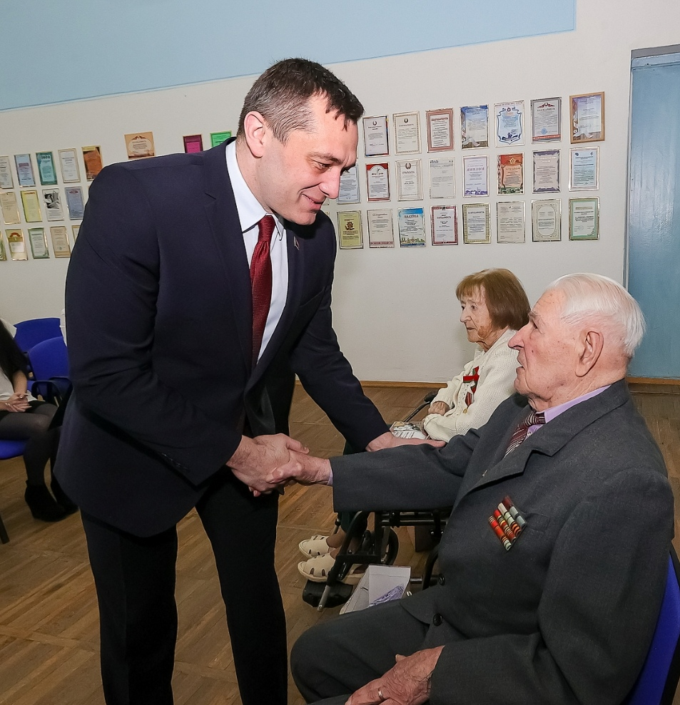 Александр Михайлович поздравил ветеранов Ивана Зайцева, Ирину Липскую и Марию Кособуцкую с приближающимся Днем Победы, поблагодарил за их подвиг и труд в годы Великой Отечественной войны и тяжёлое послевоенное время, вручил материальную помощь к празднику и ценные подарки.