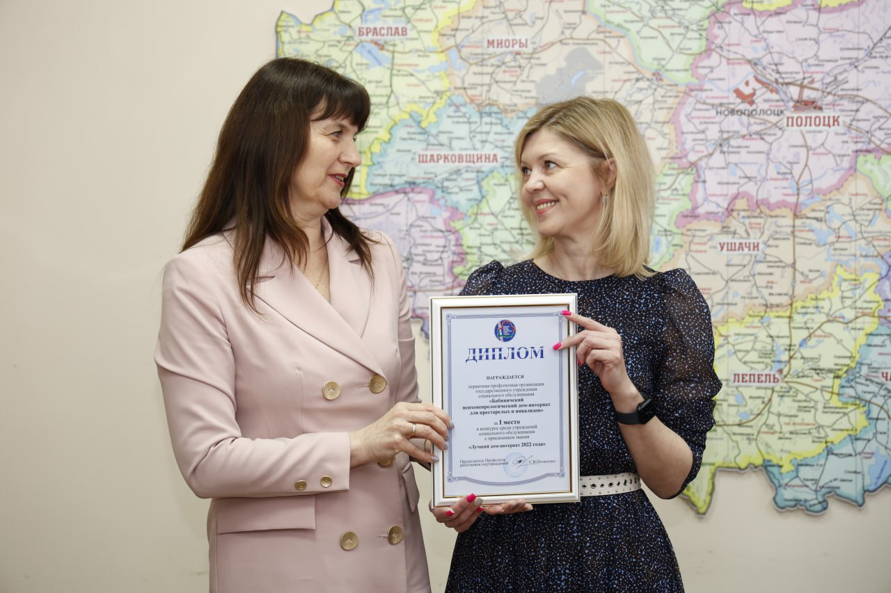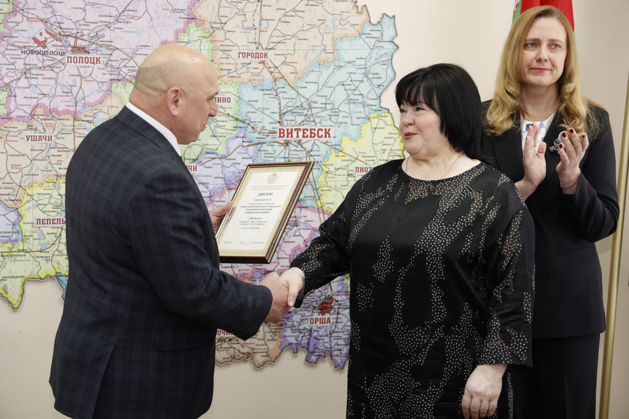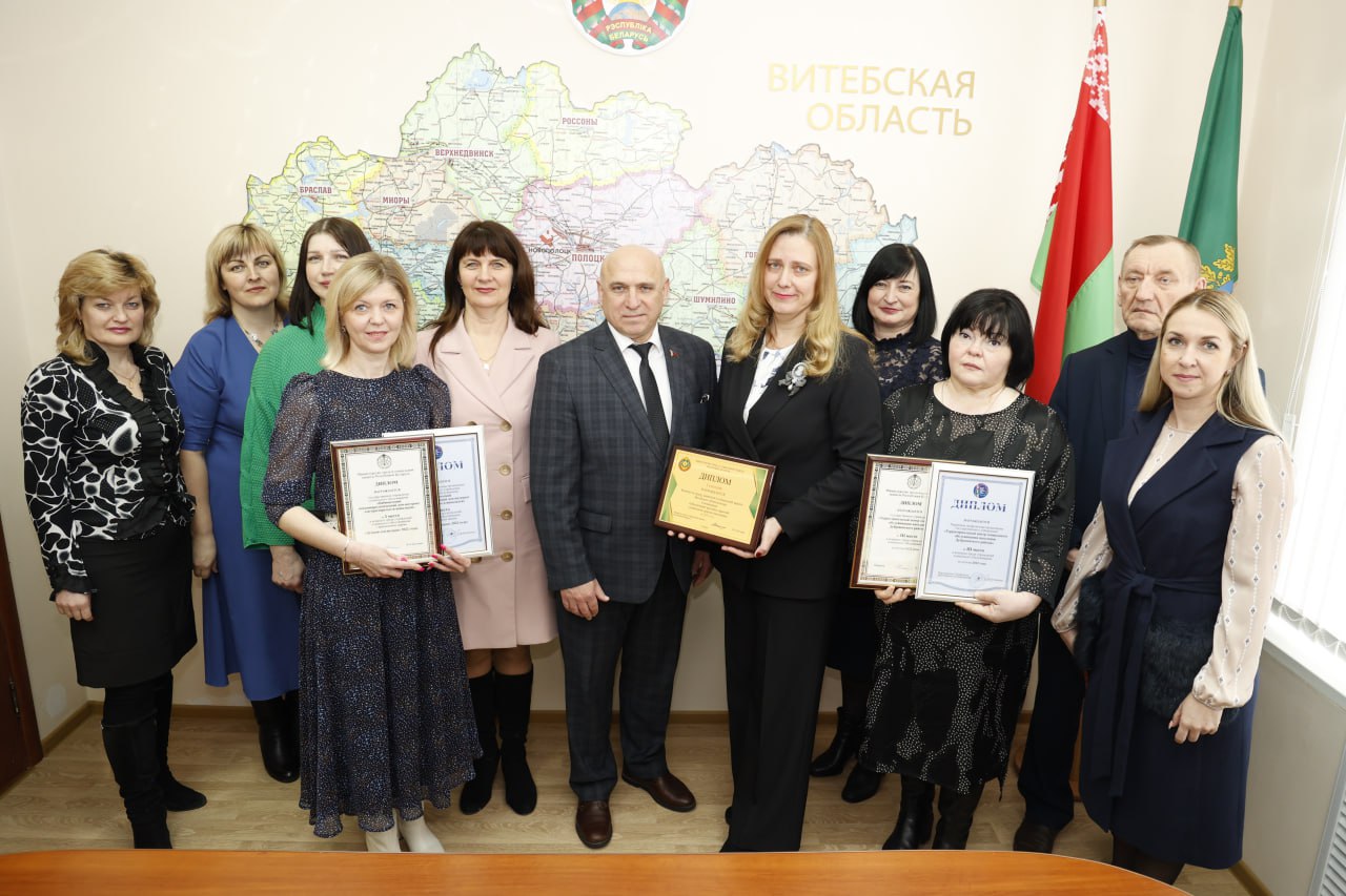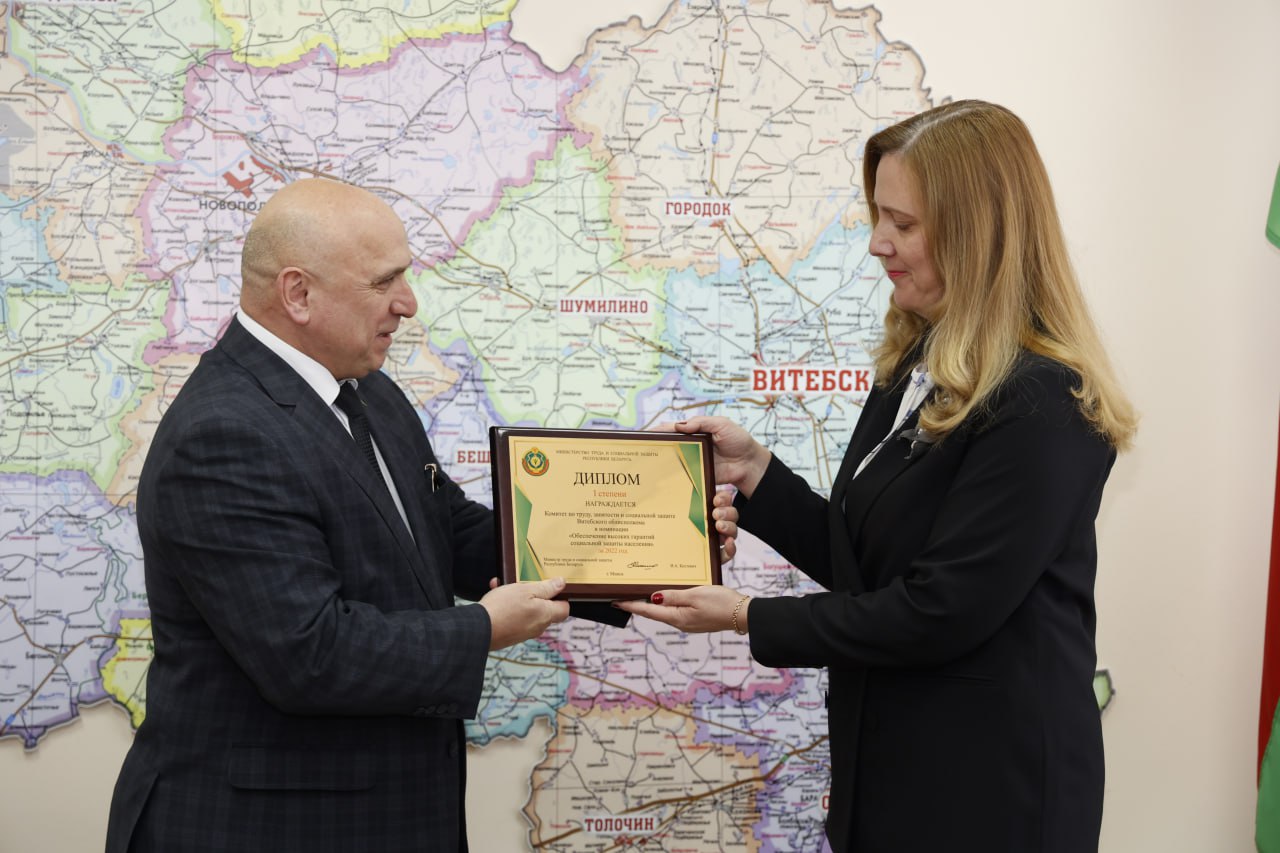 Заместитель председателя Витебского областного исполнительного комитета В.В.Дурнов с участием председателя Витебской областной организации Белорусского профсоюза работников государственных и других учреждений Е.В.Нефедовой вручил диплом I степени в номинации ”Обеспечение высоких гарантий социальной защиты населения“ по итогам соревнования среди комитетов по труду, занятости и социальной защите облисполкомов, Минского горисполкома за достижение наилучших результатов выполнения основных показателей развития социально-трудовой сферы в 2022 году комитету по труду, занятости и социальной защите Витебского областного исполнительного комитета.