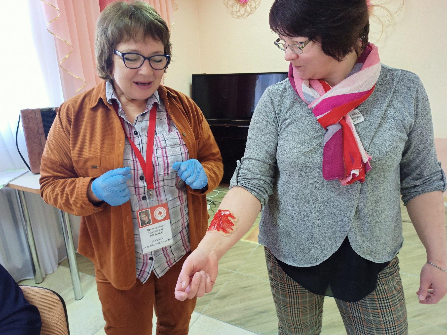 У другой частцы мерапрыемства старшыня раённага беларускага таварыства «Чырвоны крыж» Шахова Т.М. правяла навучальны семінар па аказанні першай медыцынскай дапамогі пры атрыманні траўмы.